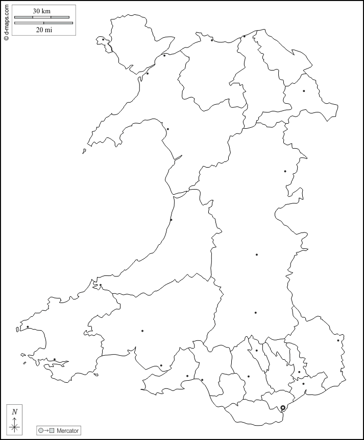 d-maps > यूरोप > युनाइटेड किंगडम > वेल्स > बाह्यरेखा, क्षेत्र, मुख्य शहरों, सफेद