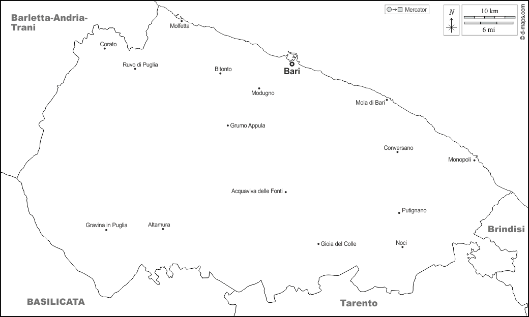 d-maps > यूरोप > इटली > बारी > सीमाओं, मुख्य शहरों, नाम, सफेद