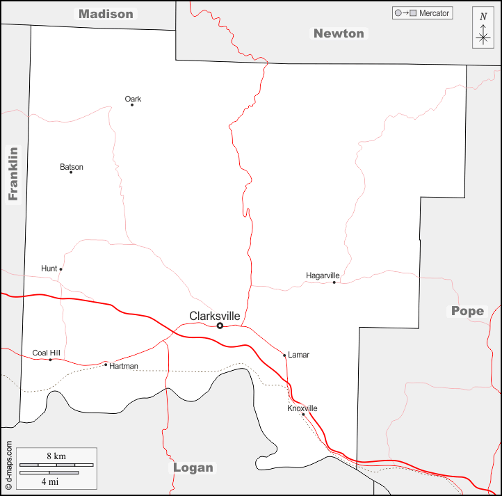 d-maps > संयुक्त राज्य > आर्कन्सा > जॉन्सन काउंटी > सीमाओं, मुख्य शहरों, सड़कों, नाम