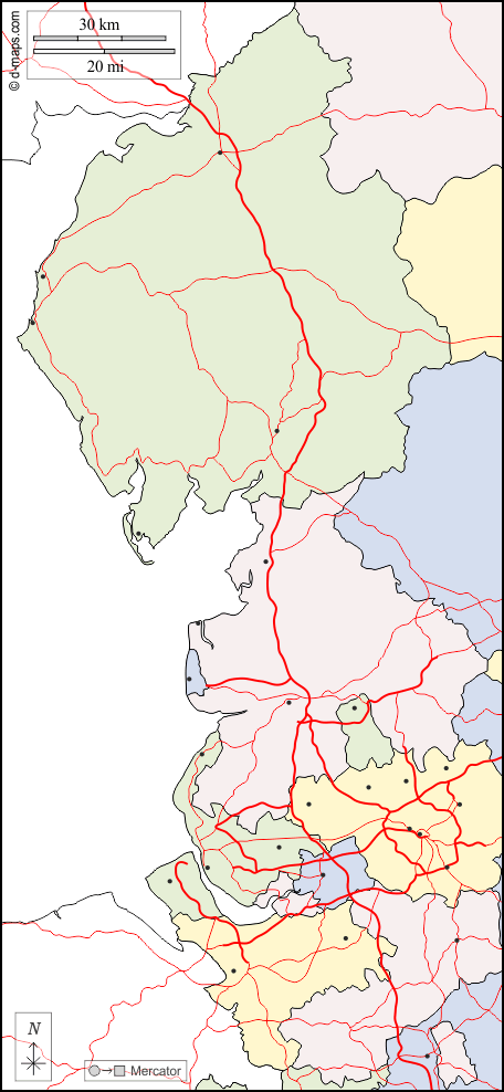 d-maps > यूरोप > युनाइटेड किंगडम > उत्तर-पश्चिम इंग्लैंड > सीमाओं, काउंटियों, मुख्य शहरों, सड़कों, रंग, सफेद