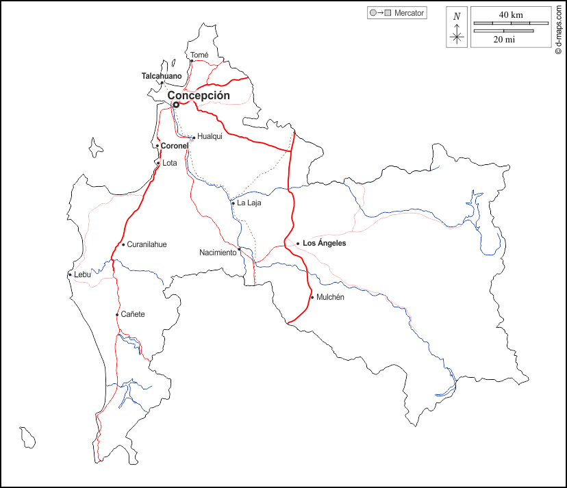 d-maps > महाअमेरिका > चिली > बियो बिओ > बाह्यरेखा, जल-सर्वेक्षण, मुख्य शहरों, सड़कों, नाम, सफेद