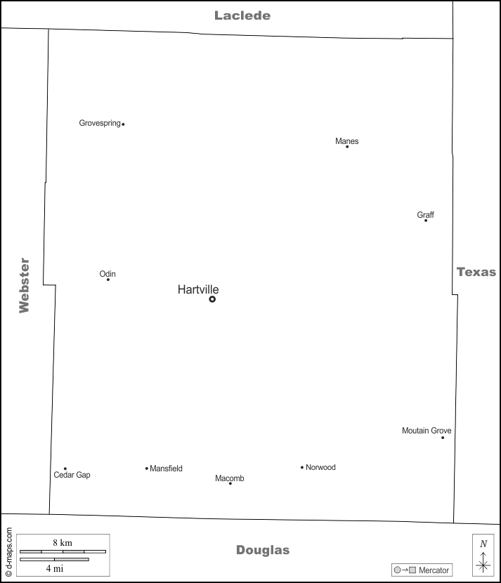d-maps > संयुक्त राज्य > मिज़ूरी > राइट काउंटी > सीमाओं, मुख्य शहरों, नाम, सफेद