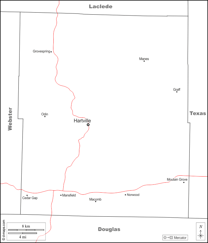 d-maps > संयुक्त राज्य > मिज़ूरी > राइट काउंटी > सीमाओं, मुख्य शहरों, सड़कों, नाम, सफेद