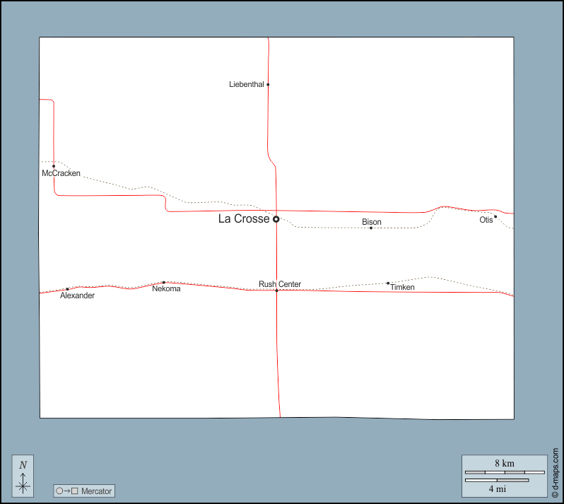d-maps > संयुक्त राज्य > कैनसस > रश काउंटी > बाह्यरेखा, मुख्य शहरों, सड़कों, नाम