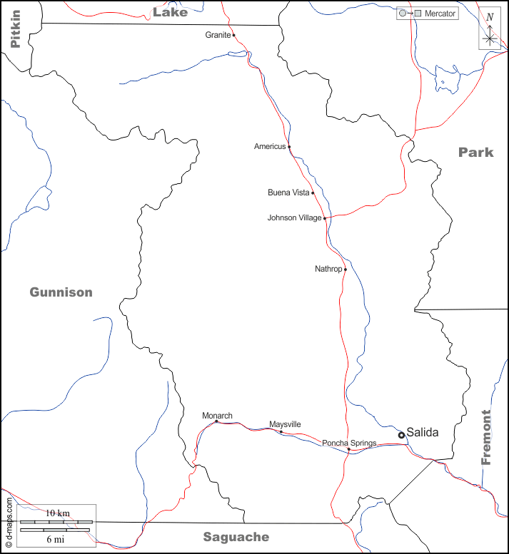 d-maps > संयुक्त राज्य > कोलोराडो > चाफ़ी काउंटी > सीमाओं, जल-सर्वेक्षण, मुख्य शहरों, सड़कों, नाम, सफेद