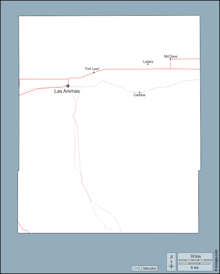 d-maps > संयुक्त राज्य > कोलोराडो > बेंट काउंटी > बाह्यरेखा, मुख्य शहरों, सड़कों, नाम
