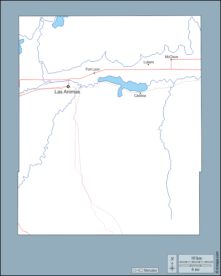 d-maps > संयुक्त राज्य > कोलोराडो > बेंट काउंटी > बाह्यरेखा, जल-सर्वेक्षण, मुख्य शहरों, सड़कों, नाम