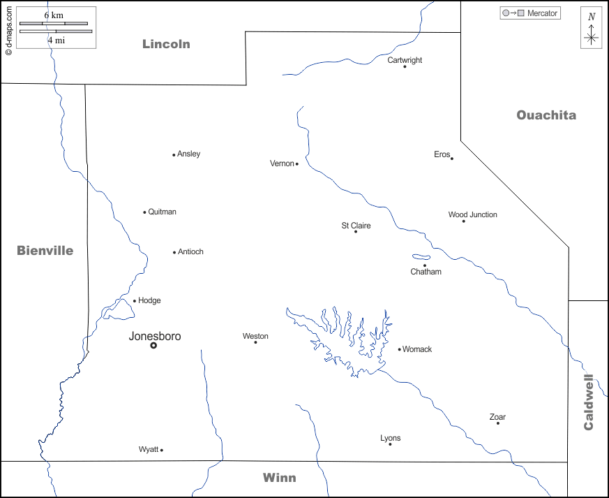 d-maps > संयुक्त राज्य > लुइसियाना > जैक्सन पैरिश > सीमाओं, जल-सर्वेक्षण, मुख्य शहरों, नाम, सफेद