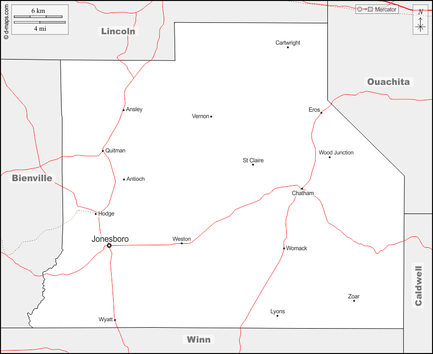 d-maps > संयुक्त राज्य > लुइसियाना > जैक्सन पैरिश > सीमाओं, मुख्य शहरों, सड़कों, नाम