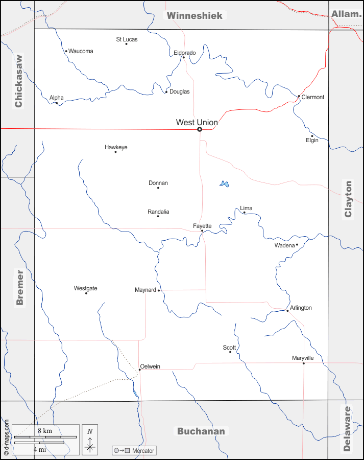 d-maps > संयुक्त राज्य > आयोवा > फेयेट काउंटी > सीमाओं, जल-सर्वेक्षण, मुख्य शहरों, सड़कों, नाम