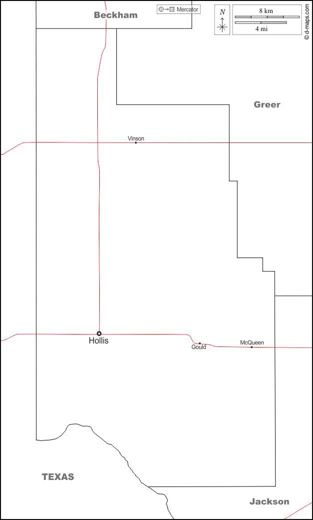 d-maps > संयुक्त राज्य > ओकलाहोमा > हार्मन काउंटी > सीमाओं, मुख्य शहरों, सड़कों, नाम, सफेद