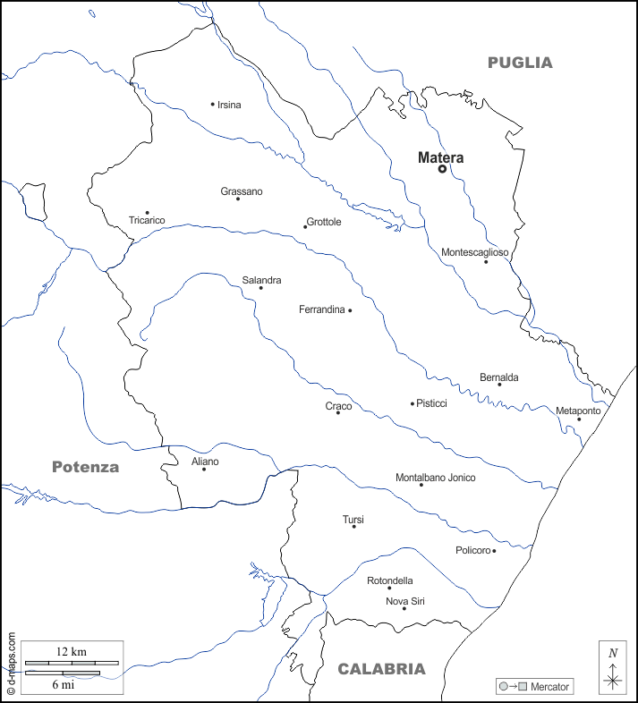 d-maps > यूरोप > इटली > मेटेरा > सीमाओं, जल-सर्वेक्षण, मुख्य शहरों, नाम, सफेद