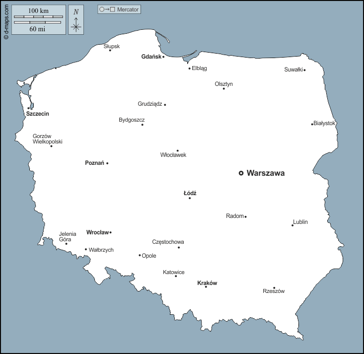 d-maps > यूरोप > पोलैंड > पोलैंड > बाह्यरेखा, मुख्य शहरों, नाम