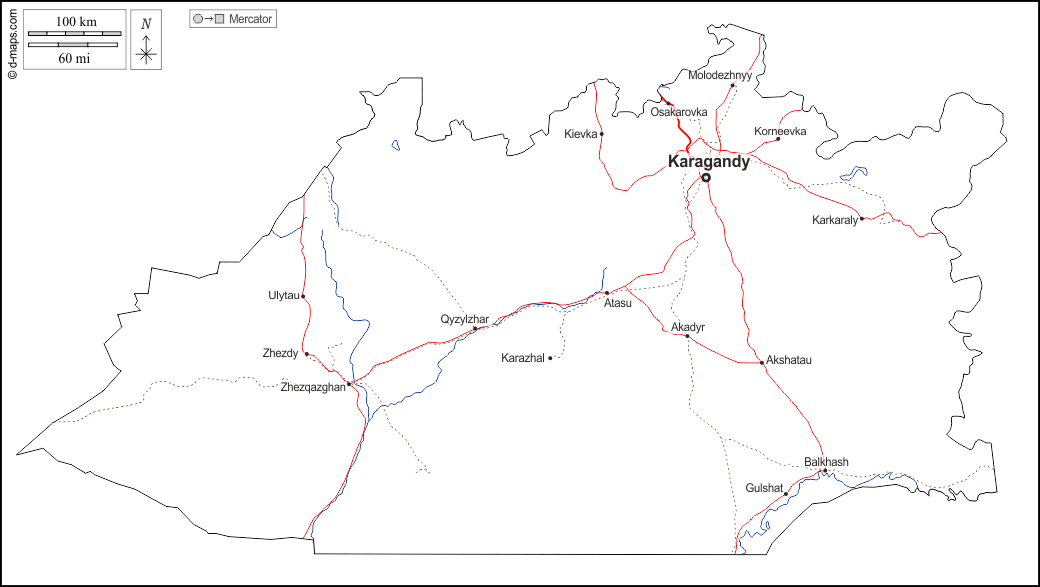 d-maps > एशिया > कज़ाकस्तान > करागांडा > बाह्यरेखा, जल-सर्वेक्षण, मुख्य शहरों, सड़कों, नाम, सफेद