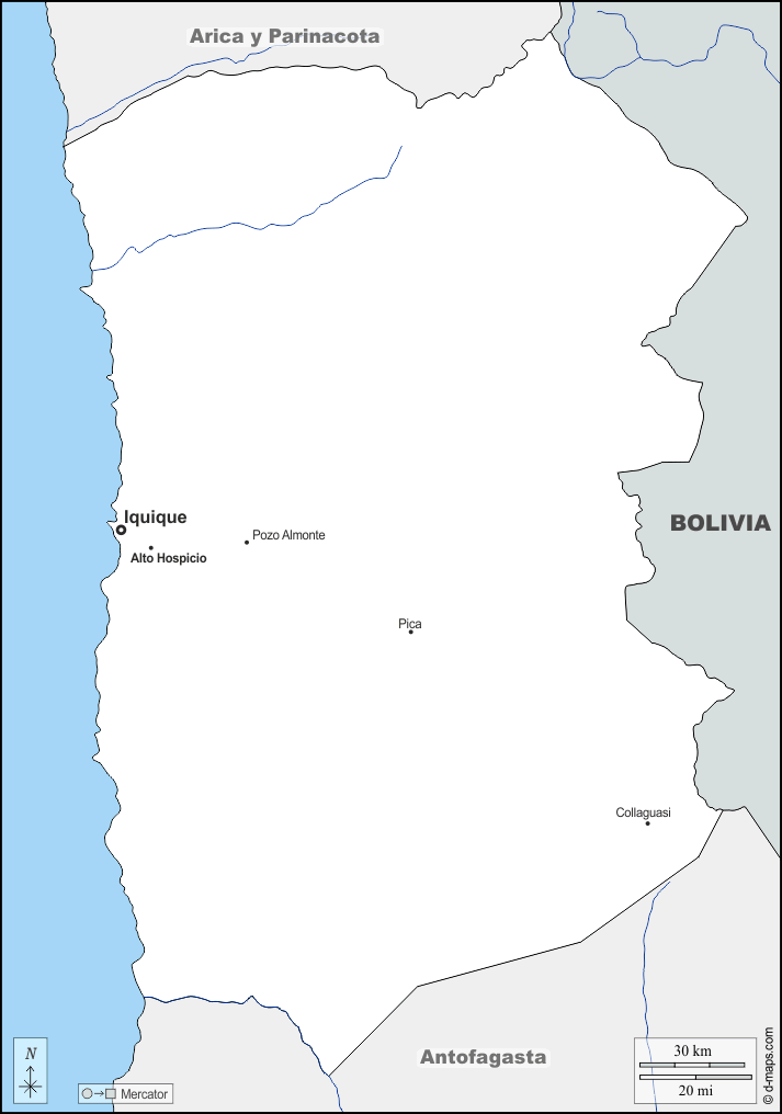 d-maps > महाअमेरिका > चिली > तारापाका > सीमाओं, जल-सर्वेक्षण, मुख्य शहरों, नाम