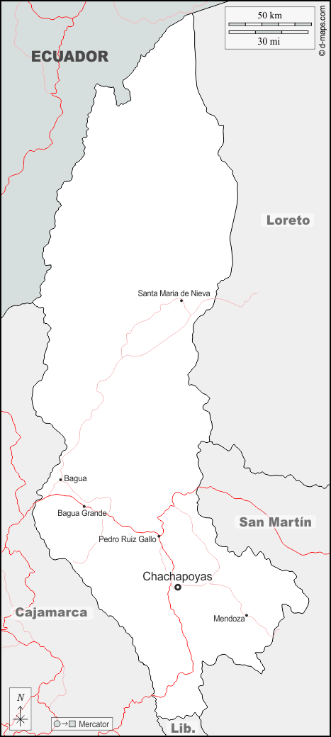 d-maps > महाअमेरिका > पेरू > अमेज़ैनस > सीमाओं, मुख्य शहरों, सड़कों, नाम, सफेद