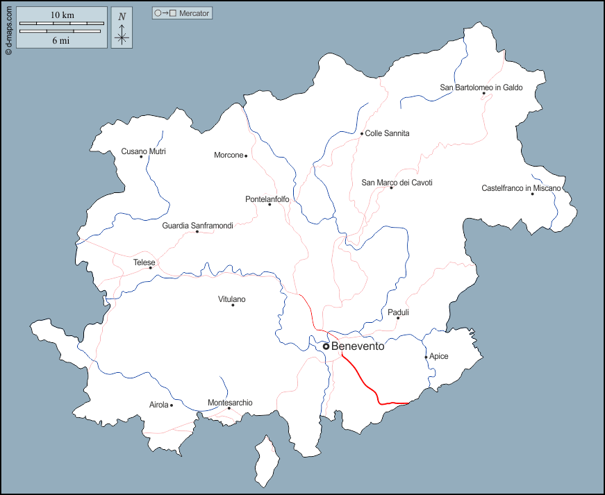d-maps > यूरोप > इटली > बेनेवेंटो > बाह्यरेखा, जल-सर्वेक्षण, मुख्य शहरों, सड़कों, नाम