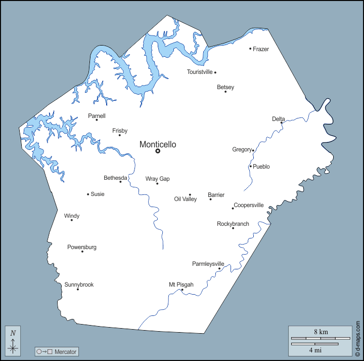 d-maps > संयुक्त राज्य > केंटुकी > वेन काउंटी > बाह्यरेखा, जल-सर्वेक्षण, मुख्य शहरों, नाम