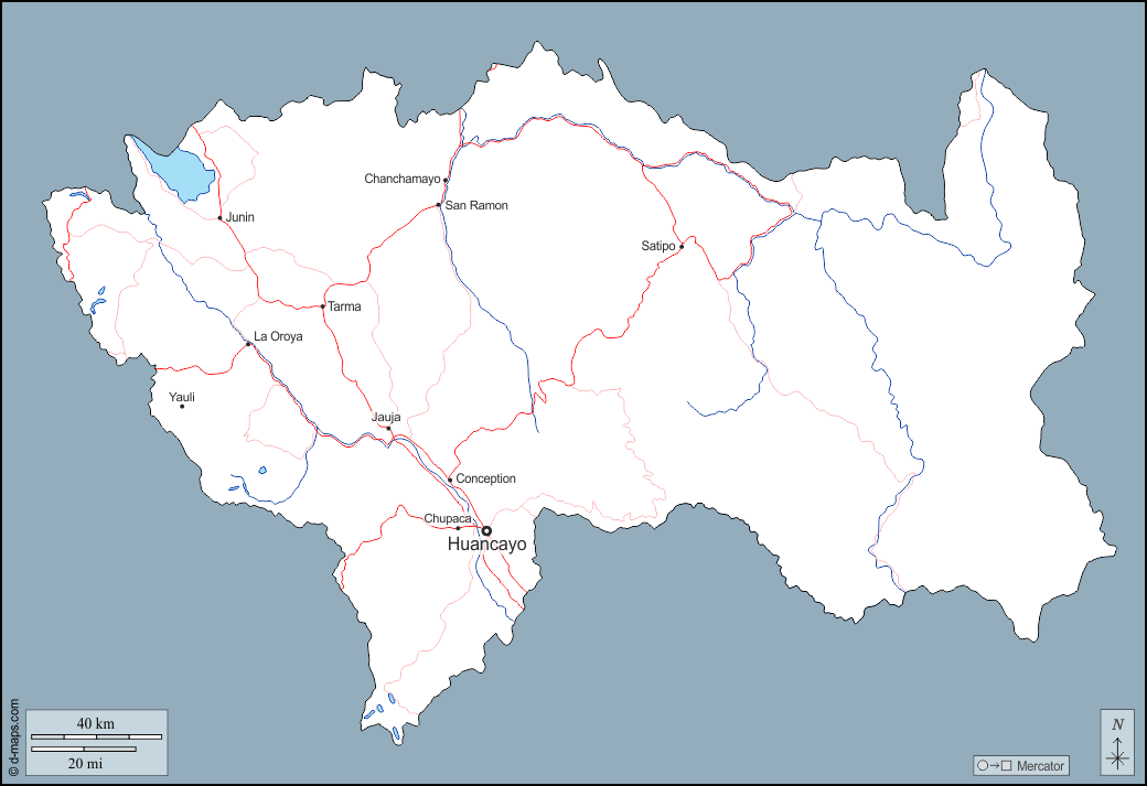 d-maps > महाअमेरिका > पेरू > जूनिन > बाह्यरेखा, जल-सर्वेक्षण, मुख्य शहरों, सड़कों, नाम
