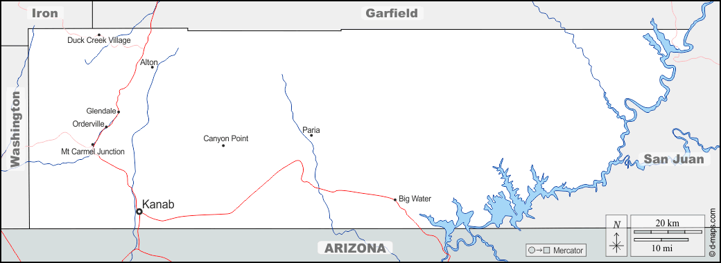 d-maps > संयुक्त राज्य > यूटा > केन काउंटी > सीमाओं, जल-सर्वेक्षण, मुख्य शहरों, सड़कों, नाम