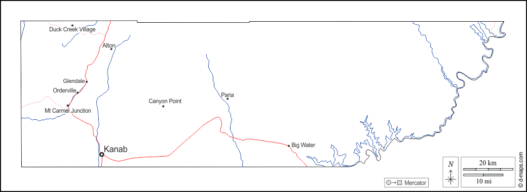 d-maps > संयुक्त राज्य > यूटा > केन काउंटी > बाह्यरेखा, जल-सर्वेक्षण, मुख्य शहरों, सड़कों, नाम, सफेद