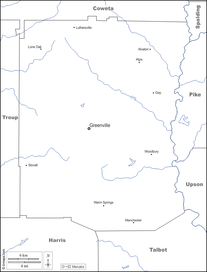 d-maps > संयुक्त राज्य > जॉर्जिया > मेरिइवेर काउंटी > सीमाओं, जल-सर्वेक्षण, मुख्य शहरों, नाम, सफेद