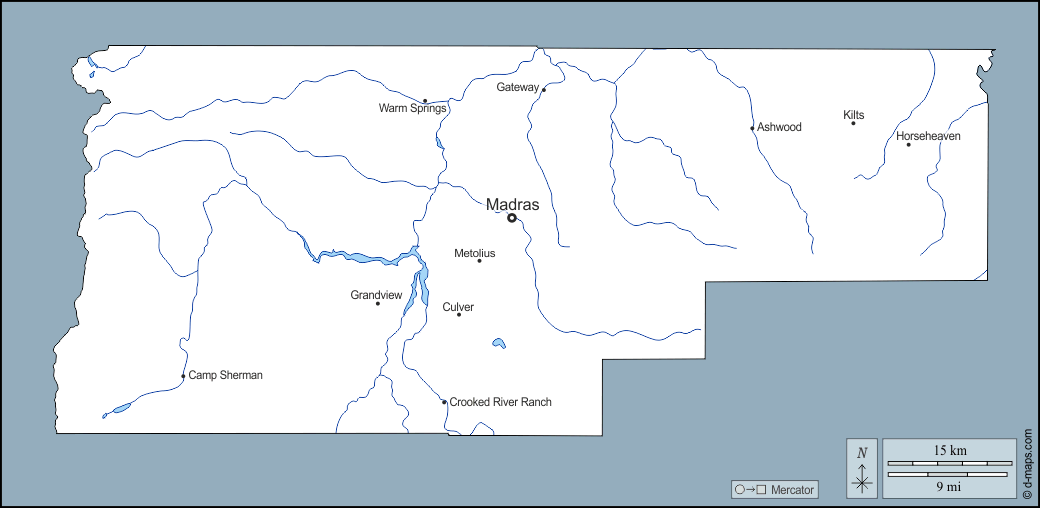 d-maps > संयुक्त राज्य > औरिगन > जेफरसन काउंटी > बाह्यरेखा, जल-सर्वेक्षण, मुख्य शहरों, नाम