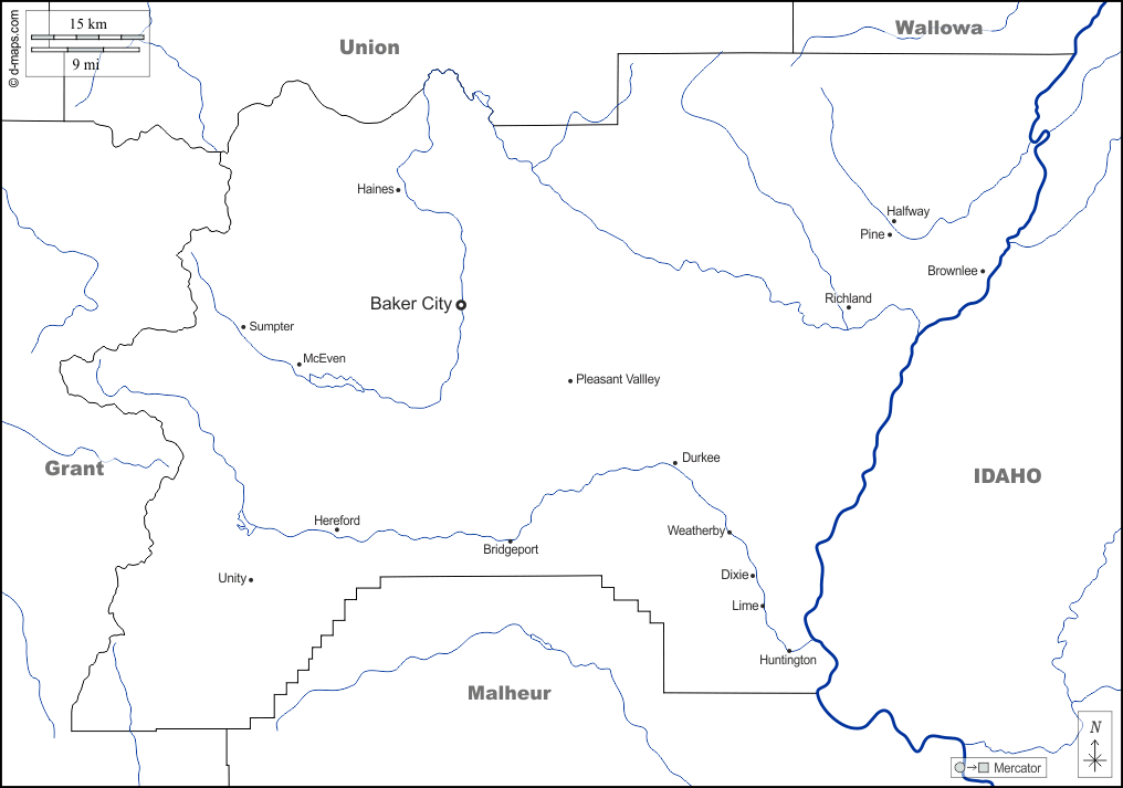 d-maps > संयुक्त राज्य > औरिगन > बेकर काउंटी > सीमाओं, जल-सर्वेक्षण, मुख्य शहरों, नाम, सफेद