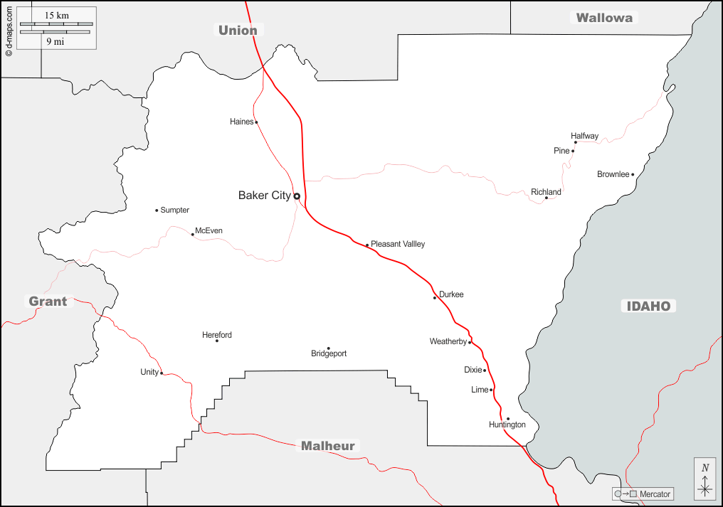 d-maps > संयुक्त राज्य > औरिगन > बेकर काउंटी > सीमाओं, मुख्य शहरों, सड़कों, नाम