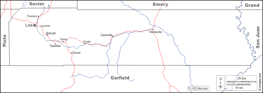 d-maps > संयुक्त राज्य > यूटा > वेन काउंटी > सीमाओं, जल-सर्वेक्षण, मुख्य शहरों, सड़कों, नाम, सफेद