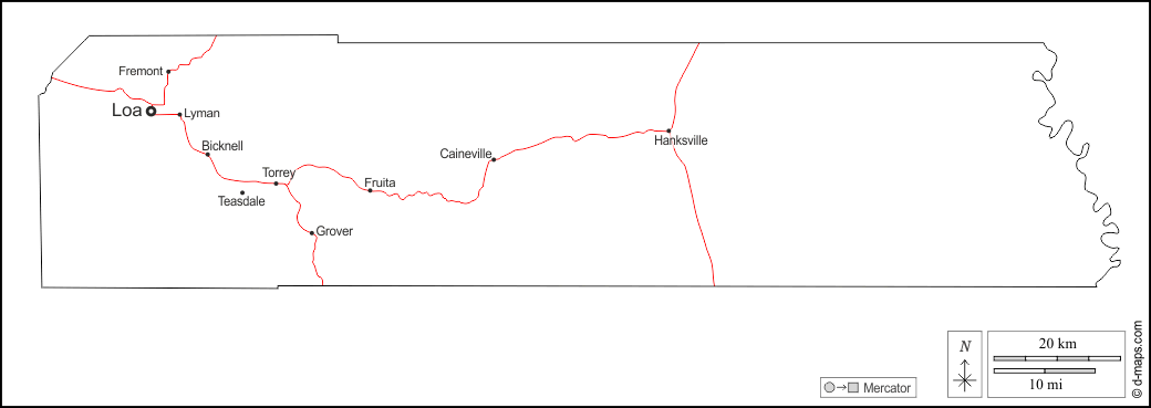 d-maps > संयुक्त राज्य > यूटा > वेन काउंटी > बाह्यरेखा, मुख्य शहरों, सड़कों, नाम, सफेद