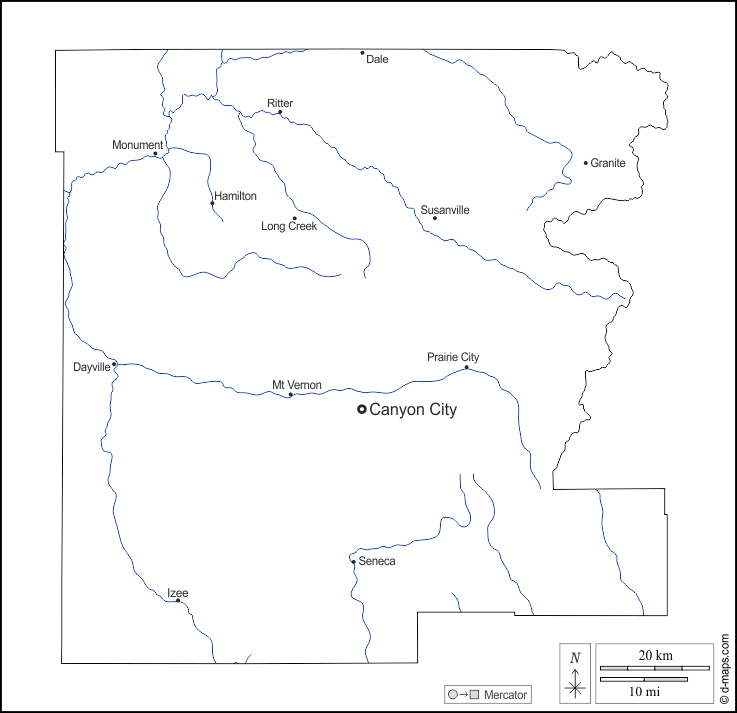 d-maps > संयुक्त राज्य > औरिगन > ग्रांट काउंटी > बाह्यरेखा, जल-सर्वेक्षण, मुख्य शहरों, नाम, सफेद