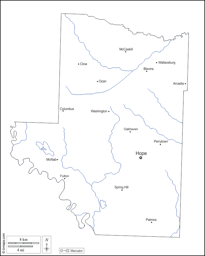 d-maps > संयुक्त राज्य > आर्कन्सा > हेम्पस्टेड काउंटी > बाह्यरेखा, जल-सर्वेक्षण, मुख्य शहरों, नाम, सफेद
