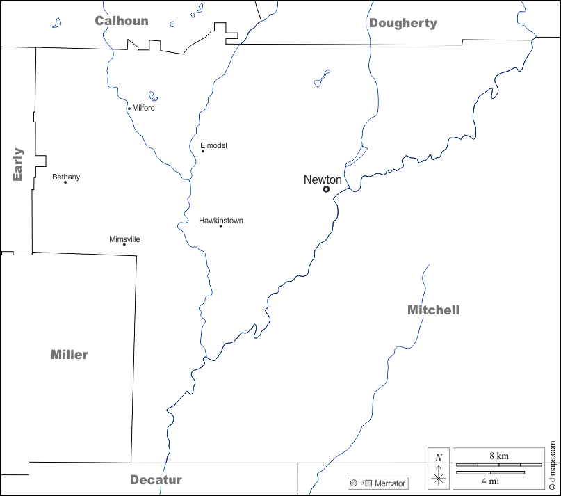 d-maps > संयुक्त राज्य > जॉर्जिया > बेकर काउंटी > सीमाओं, जल-सर्वेक्षण, मुख्य शहरों, नाम, सफेद