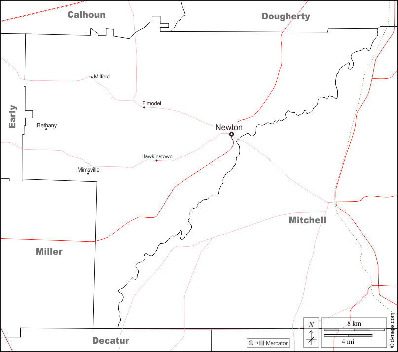d-maps > संयुक्त राज्य > जॉर्जिया > बेकर काउंटी > सीमाओं, मुख्य शहरों, सड़कों, नाम, सफेद