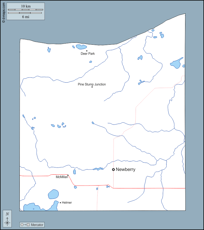 d-maps > संयुक्त राज्य > मिशिगन > लुसे काउंटी > बाह्यरेखा, जल-सर्वेक्षण, मुख्य शहरों, सड़कों, नाम
