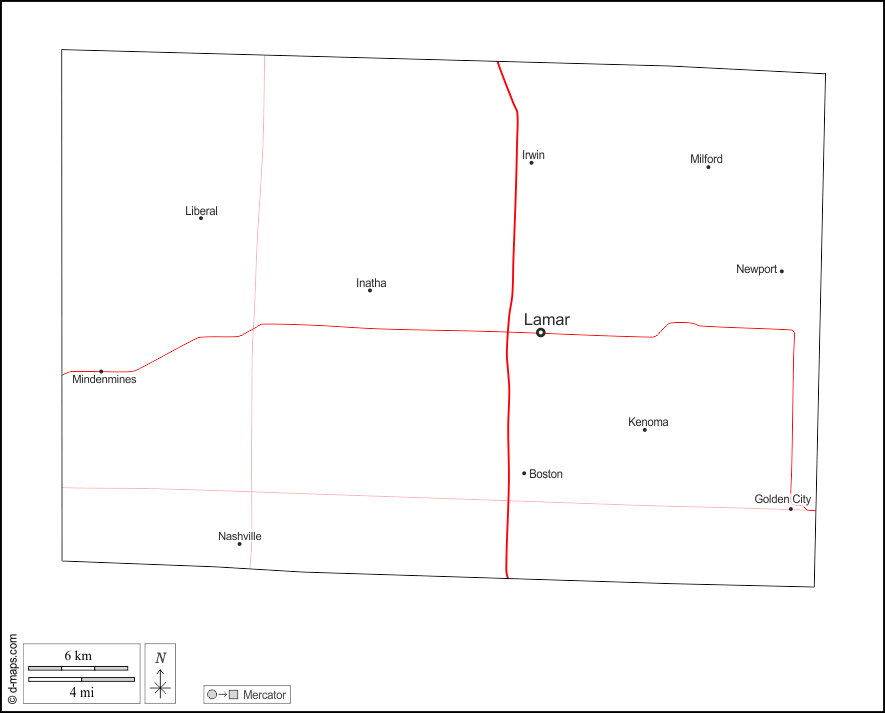 d-maps > संयुक्त राज्य > मिज़ूरी > बार्टन काउंटी > बाह्यरेखा, मुख्य शहरों, सड़कों, नाम, सफेद
