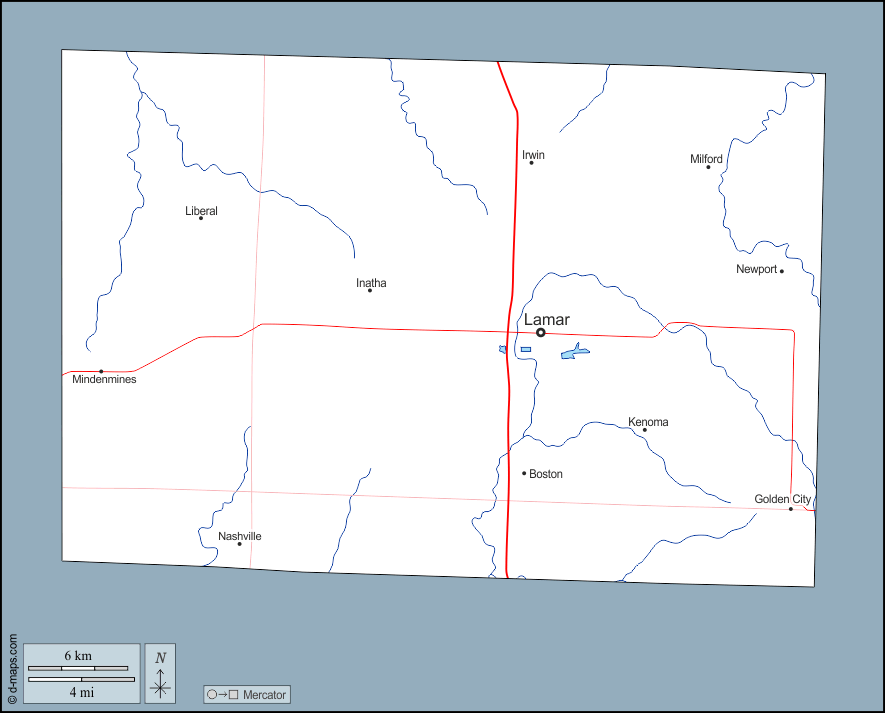 d-maps > संयुक्त राज्य > मिज़ूरी > बार्टन काउंटी > बाह्यरेखा, जल-सर्वेक्षण, मुख्य शहरों, सड़कों, नाम
