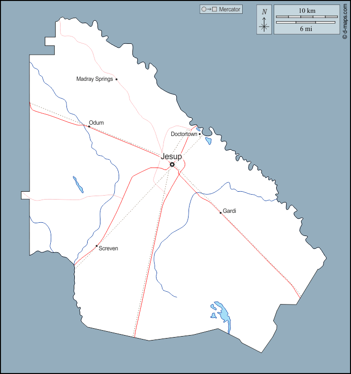 d-maps > संयुक्त राज्य > जॉर्जिया > वेन काउंटी > बाह्यरेखा, जल-सर्वेक्षण, मुख्य शहरों, सड़कों, नाम