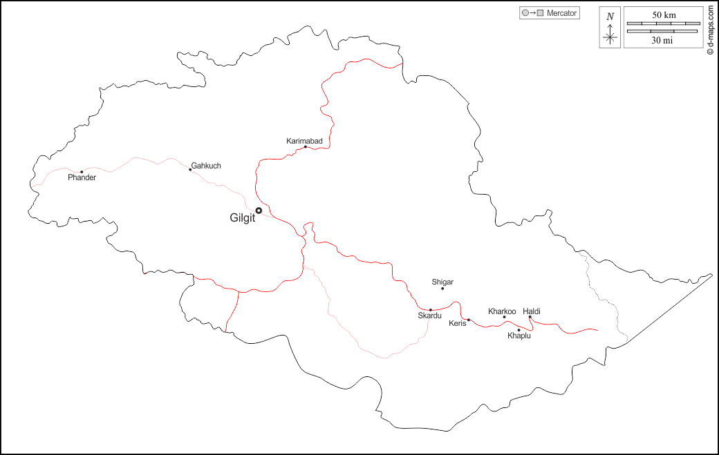 d-maps > एशिया > पाकिस्तान > गिलगित-बल्तिस्तान > बाह्यरेखा, मुख्य शहरों, सड़कों, नाम, सफेद