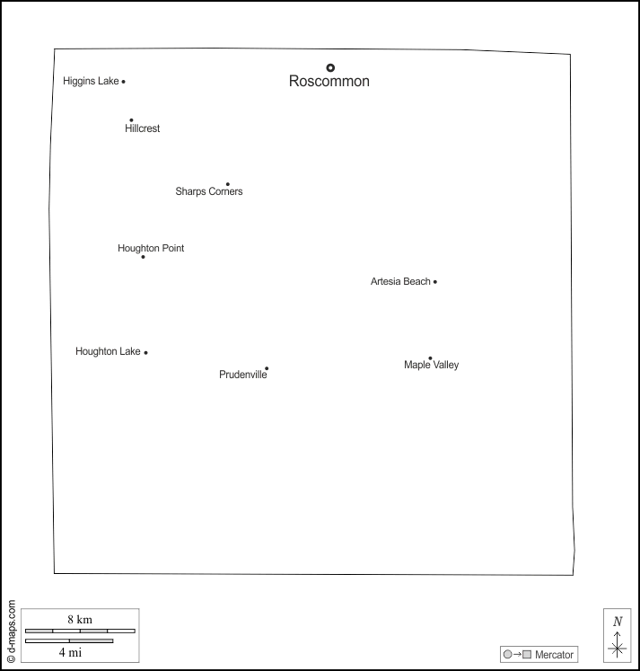 d-maps > संयुक्त राज्य > मिशिगन > रोज कॉमन काउंटी > बाह्यरेखा, मुख्य शहरों, नाम, सफेद