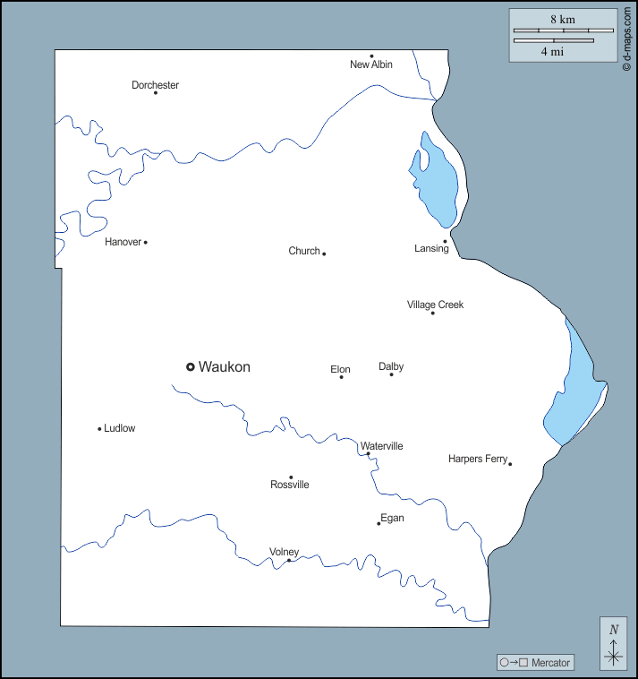 d-maps > संयुक्त राज्य > आयोवा > अलामाके काउंटी > बाह्यरेखा, जल-सर्वेक्षण, मुख्य शहरों, नाम