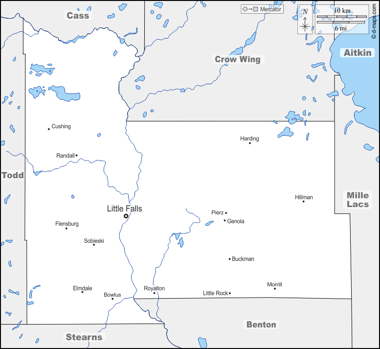 d-maps > संयुक्त राज्य > मिनेसोटा > मॉरिसन काउंटी > सीमाओं, जल-सर्वेक्षण, मुख्य शहरों, नाम