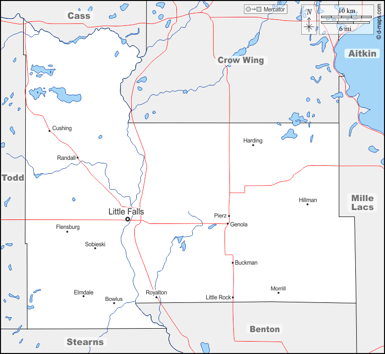d-maps > संयुक्त राज्य > मिनेसोटा > मॉरिसन काउंटी > सीमाओं, जल-सर्वेक्षण, मुख्य शहरों, सड़कों, नाम
