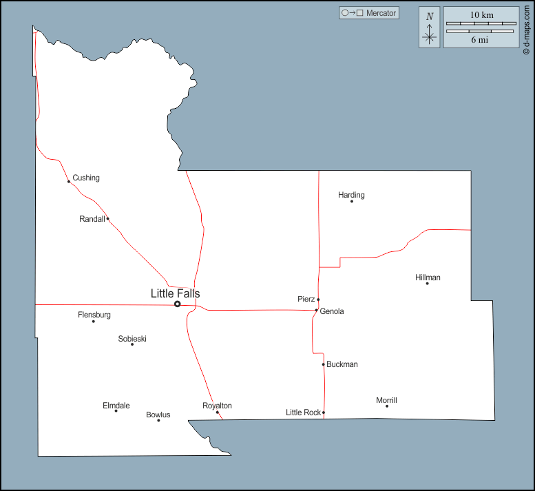 d-maps > संयुक्त राज्य > मिनेसोटा > मॉरिसन काउंटी > बाह्यरेखा, मुख्य शहरों, सड़कों, नाम
