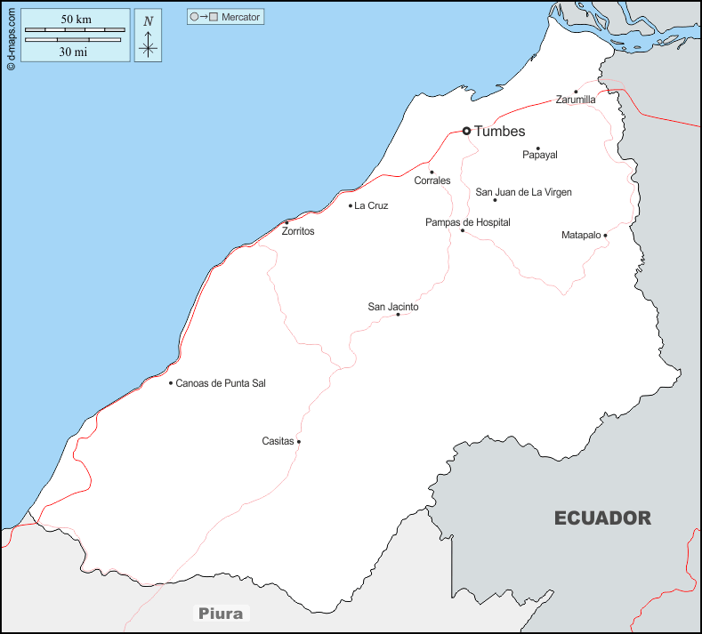 d-maps > महाअमेरिका > पेरू > टुम्बस > सीमाओं, मुख्य शहरों, सड़कों, नाम