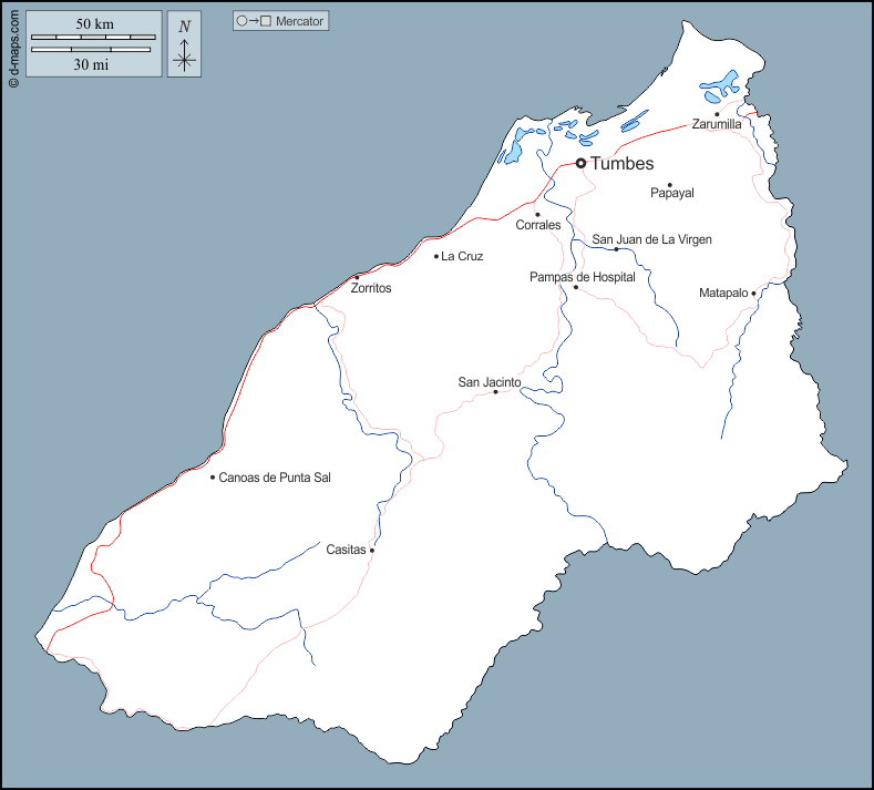 d-maps > महाअमेरिका > पेरू > टुम्बस > बाह्यरेखा, जल-सर्वेक्षण, मुख्य शहरों, सड़कों, नाम