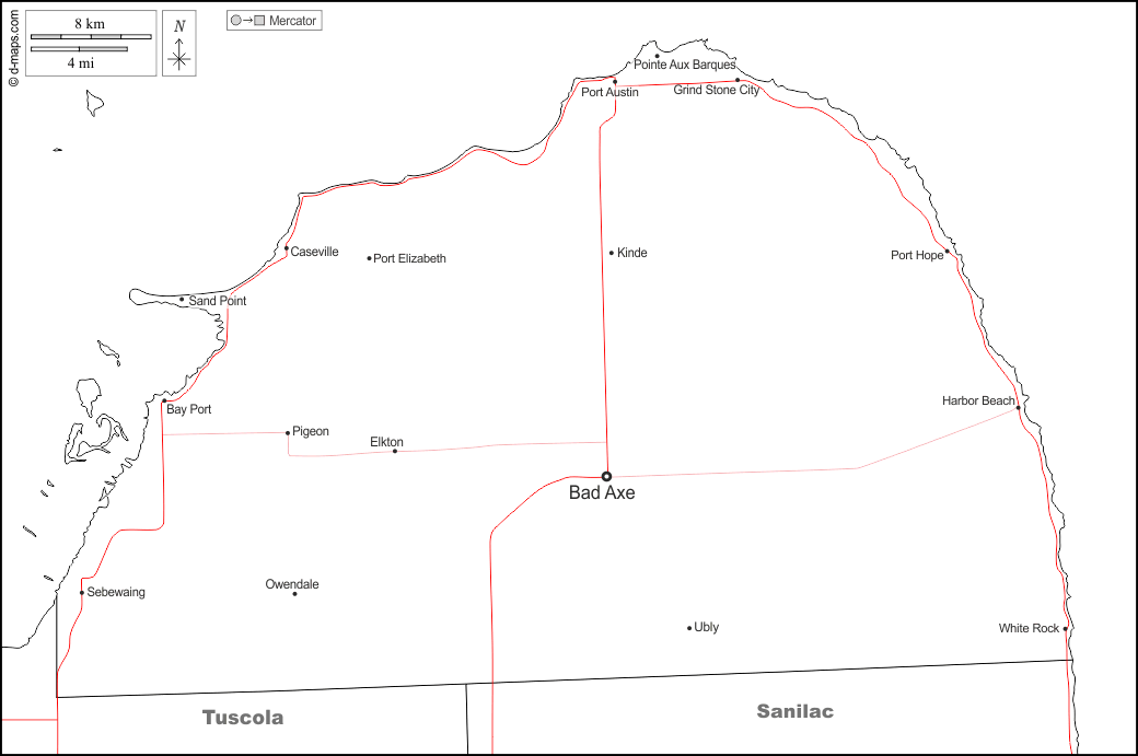 d-maps > संयुक्त राज्य > मिशिगन > हुरोन काउंटी > सीमाओं, मुख्य शहरों, सड़कों, नाम, सफेद