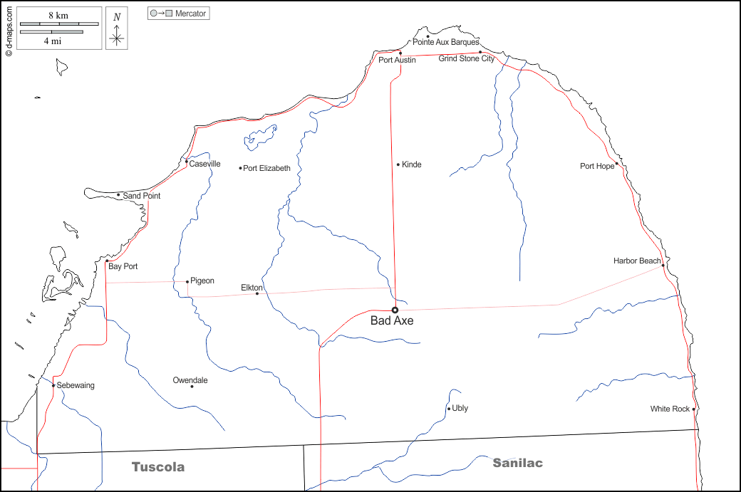 d-maps > संयुक्त राज्य > मिशिगन > हुरोन काउंटी > सीमाओं, जल-सर्वेक्षण, मुख्य शहरों, सड़कों, नाम, सफेद