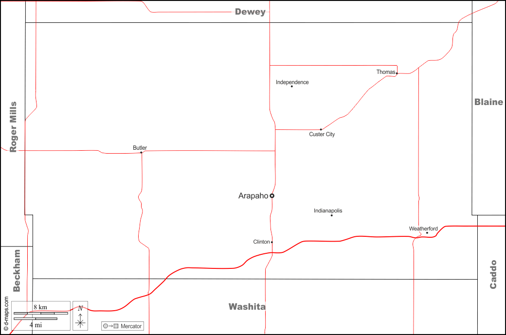d-maps > संयुक्त राज्य > ओकलाहोमा > कस्टर काउंटी > सीमाओं, मुख्य शहरों, सड़कों, नाम, सफेद